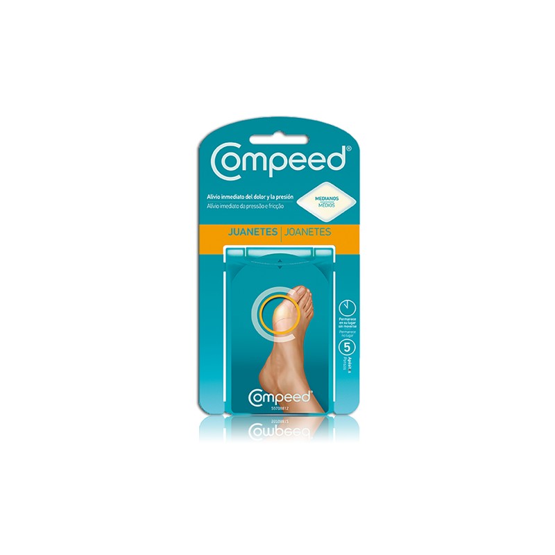 Los Apósitos Compeed Juanetes Medianos han sido creados específicamente para que se adapten a la articulación del pie con la máxima comodidad. La tecnología Hidrocoloide ayuda a suavizar la piel y amortiguar cualquier presión, evitando por lo tanto inflamación, ampollas y un mayor engrosamiento de la piel alrededor del juanete.